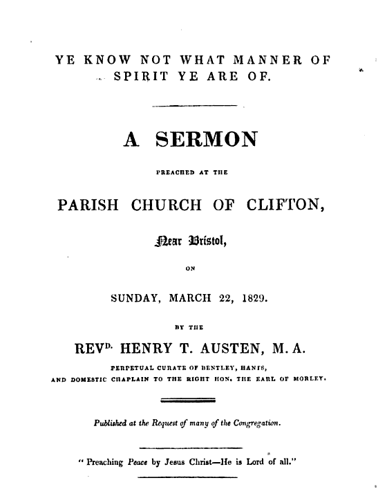Henry Austen’s sermon: “Ye Know Not What Manner of Spirit Ye Are of.”